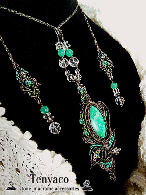 柔らかな半透明のグリーンを湛えたオーストラリア産のクリソプレーズを自家研磨してクリスタルクォーツを交えたマクラメペンダントに編み上げました。