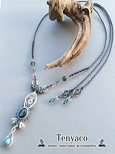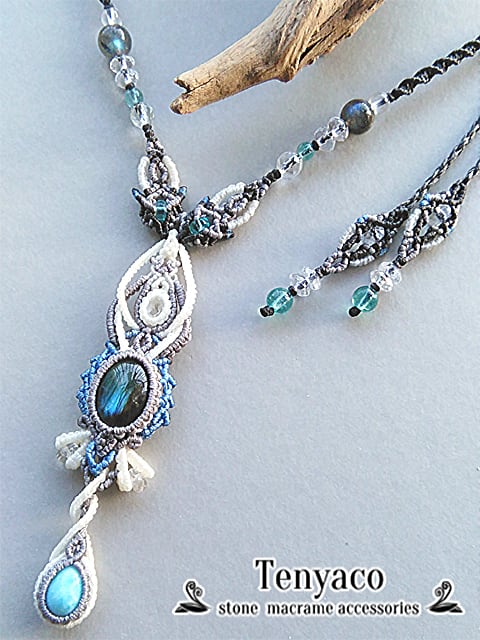 美しいスカイブルーのシラーが浮かぶラブラドライトと、柔らかな水色のラリマーを合わせてマクラメペンダントに仕立てました。