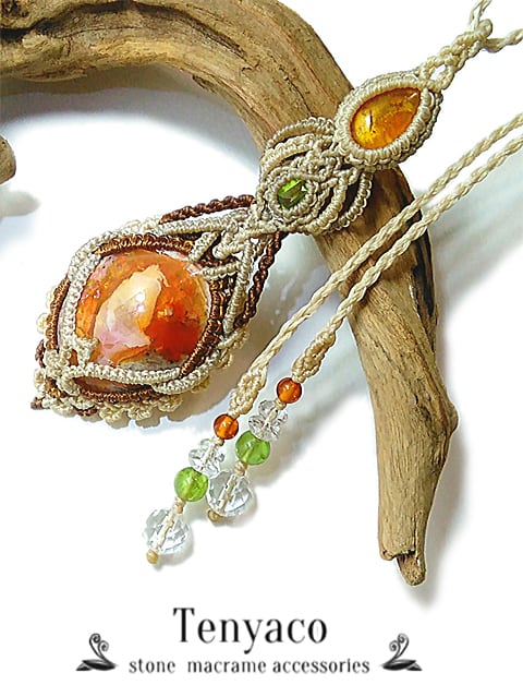 メキシコ産大カンテラオパールとバルティックアンバー&ペリドットのマクラメペンダント