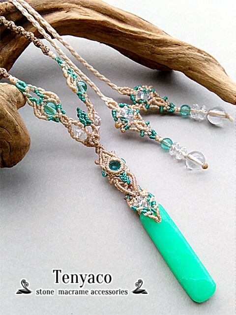 鮮やかな色味のオーストラリア産のクリソプレーズを研磨し、スティックルースに仕立て、爽やかな南海色のブルーアパタイトと輝きの美しいクリスタルクォーツをお供にマクラメペンダントに仕上げました。