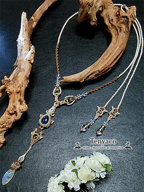 タンザナイトとホワイトラブラドライト&ペリドットのマクラメペンダント