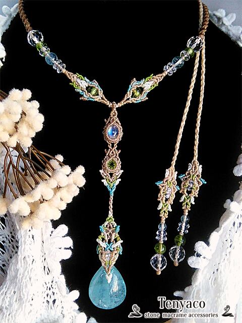 柔らかな水の色をしたアクアマリンに鮮やかな黄緑のペリドットと、スカイブルー&オレンジのシラー閃くホワイトラブラドライトを編みこんだマクラメペンダント。