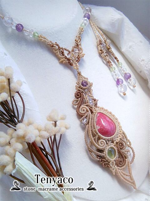 プレナイト、ラベンダーアメジストに天然原石から自家研磨したノルウェー産チューライトをメインにクリスタルクォーツを添えたオリジナルデザインで編み上げました。