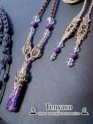 絹のような不思議な光沢と複雑な表情を見せるチャロアイトとアクアマリンを編み込みました。