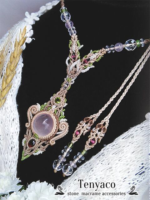 ぷっくりとしたローズクォーツのルースを自家研磨しまして、ガーネット&ロードライトガーネットにペリドットとクリスタルクォーツを合わせてマクラメペンダントに仕上げました。