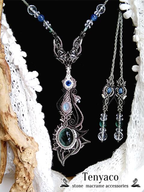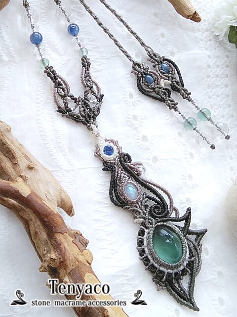 ブルーグリーンフローライトとカイヤナイトのマクラメペンダント