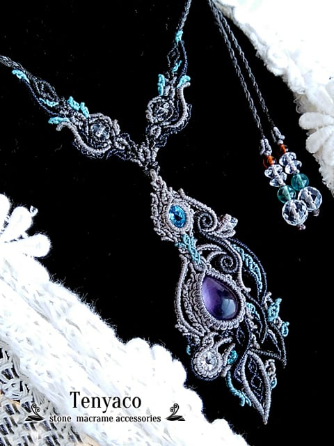 パープルフローライトとスイスブルートパーズのマクラメペンダント