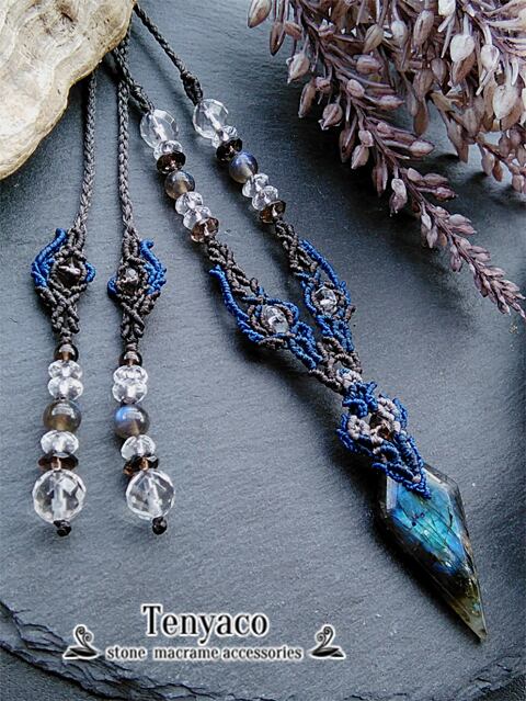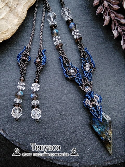 スカイブルーのシラーが美しいラブラドライトをブルー&グレー、ブラックの紐とスモーキークォーツ、クリスタルクォーツでシックに飾りました。