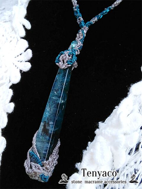 カイヤナイトの原石を自家研磨し、穴を開けずに紐で包み編んでペンダントに仕上げました。