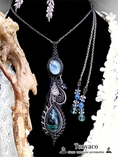 カイヤナイト+水晶ダブレットとグリーンフローライトのマクラメペンダント