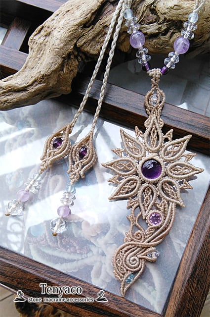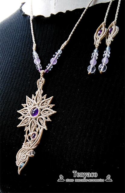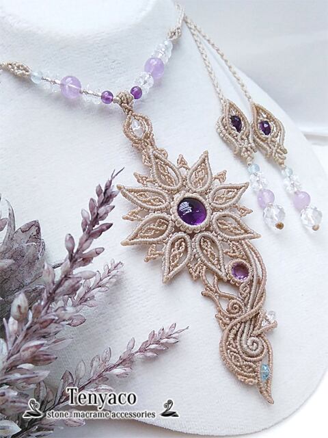 八枚の花弁でルースを包んだ天華シリーズ、アメジスト&アクアマリンのマクラメペンダント。
