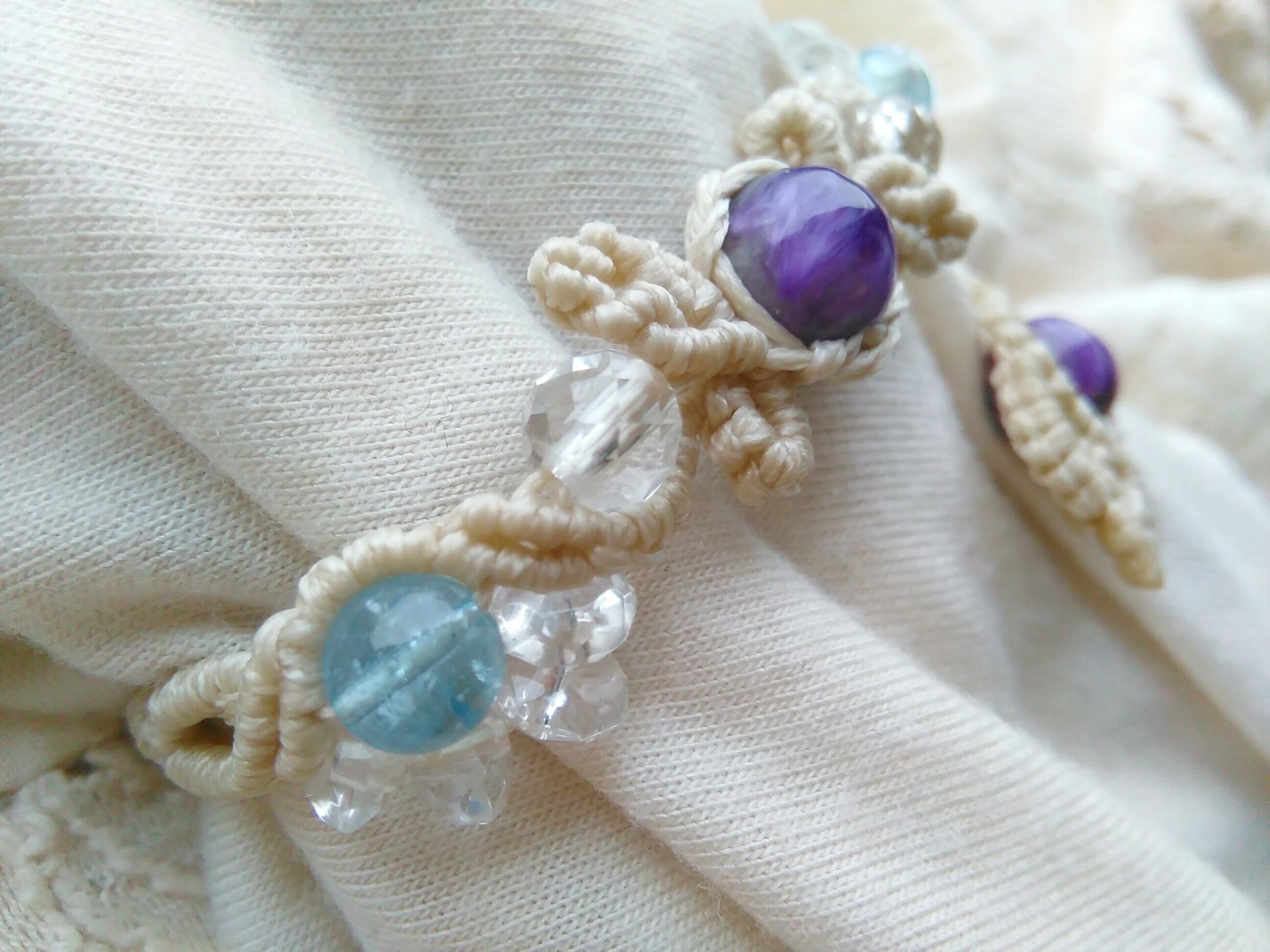 紫の絹糸を束ねたような石、チャロアイトをメインに透明度の高いアクアマリンと輝くクリスタルクォーツを生成り色のロウ引き紐で包んだ上品な色合いのブレスレットです。