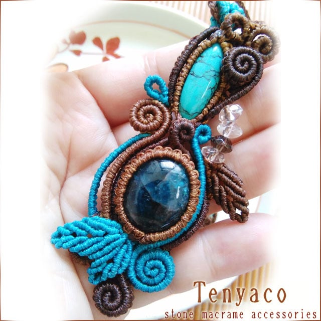ネット模様のターコイズと深海色のブルーアパタイトをブラウンとターコイズ色の蝋引き紐で編み上げました。