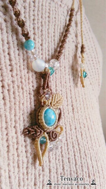 青みの強いドミニカ産ラリマーにムーンストーンとブルーアパタイトをあしらってクリスタルクォーツで纏めたマクラメ編みのペンダント&ブレスレット。