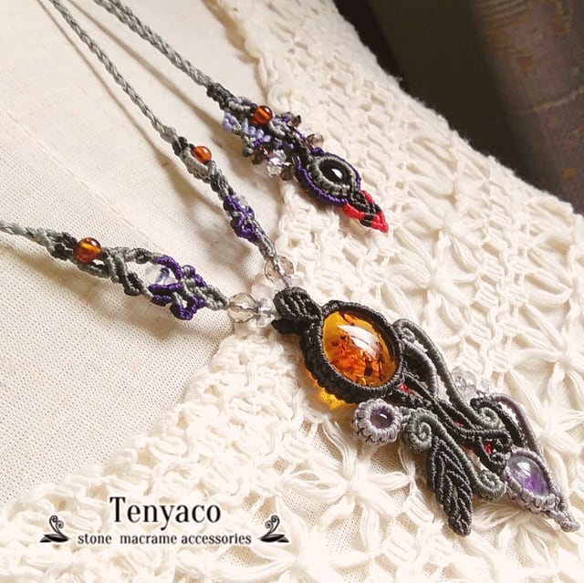 サン・スパングルとも呼ばれる輝く円状の内包物を湛えたポーランド産のアンバーをメインにアメジストとガーネットを加えて編み上げました。