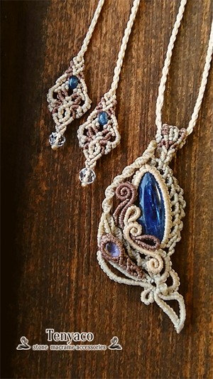 ブラジル産のカイヤナイト原石を研磨し、オリジナルデザインのマクラメペンダントに仕上げました。