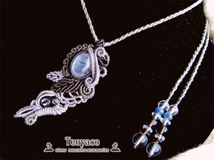 透きとおるような白い地肌に青紫~空色のシラーが閃くホワイトラブラドライトとカットされた小さなホワイトトパーズを配置、雪をイメージしたデザインを蠟引き紐だけで編み上げました。