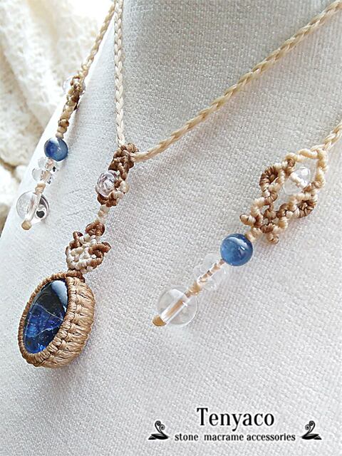 板状に研磨したカイヤナイトと水晶ルースを難黄変性樹脂GM‐9050で貼り合わせたダブレットルースをマクラメでシンプルに包んでみました。