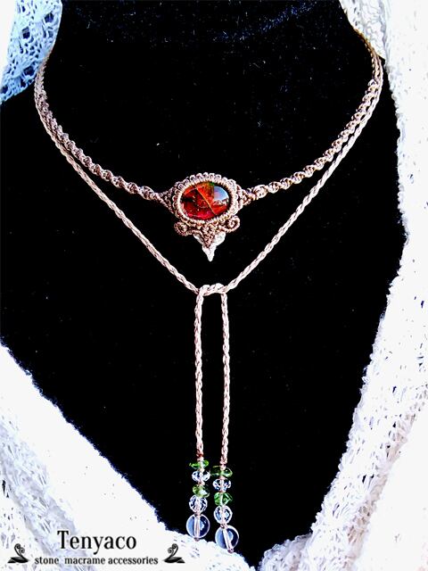 板状のアンモライトに水晶ルースを難黄変性樹脂GM‐9050で貼り合わせたダブレットルースをマクラメで包んだチョーカー&ブレスレットです。