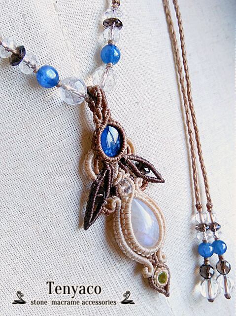 ブラジル産のカイヤナイトとペリドットのカットルースで手磨きしたホワイトラブラドライトを挟み込み、飾り編みで仕上げたペンダントです。