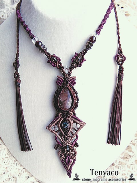 ところどころ透明度のあるアンダリュサイトと輝く星粒のようなブルースピネルを合わせて操舵輪をモチーフとしたマクラメペンダントに編み上げました。