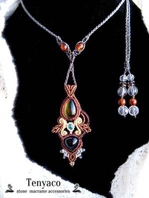 調節部先端にはスモーキークォーツとクリスタルクォーツも配置、ダークグレー&ブラウンの紐でペンダントに仕立ててあります。