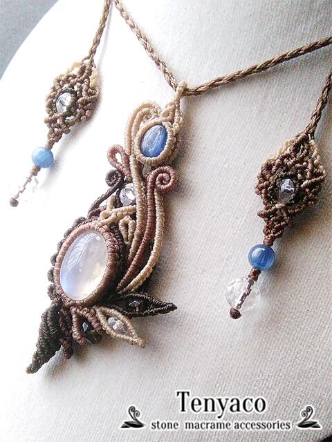 柔らかなスカイブルーのシラー輝くホワイトラブラドライトと、穏やかな藍色に光るブラジル産のカイヤナイトをクリスタルクォーツとスモーキークォーツのボタンカットを微妙に色合いの違う4色の蝋引き紐で編みこみ包んでマクラメペンダントに仕上げました。